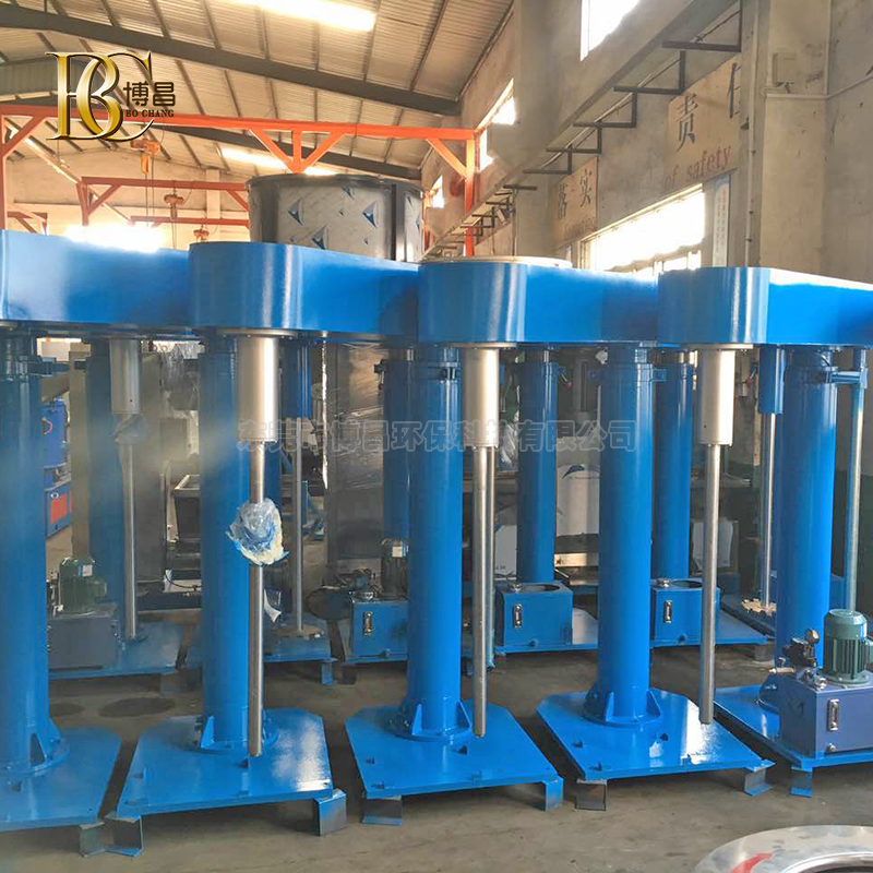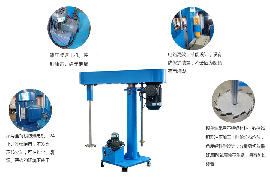 液壓高速分散機的鋸齒狀圓形分散盤在容器內高速旋轉完成固液分散、濕潤、解聚、穩定過程,使漿液呈滾動環狀流,產生強旋渦,漿液表面粒子呈螺旋狀下降到渦流底部;在分散盤邊緣2.5-5mm處形成湍流區,漿料及粒子受到強烈剪切及沖擊;區域外形成上下兩個束流,漿料得到充分循環及翻動;分散機的分散盤下方呈層流狀態,不同流速的漿料層互相擴散,起到分散作用。液壓高速分散機具有液壓升降、360度回轉、無級調速等多種功能??赏瑫r配置2-4只容器,液壓升降行程1000㎜、360度回轉功能能更好的滿足一機多用,能夠在很短的時間內從一個缸變換到另一個缸進行作業,大大的提高了工作效率,同時也降低了人工勞動強度。